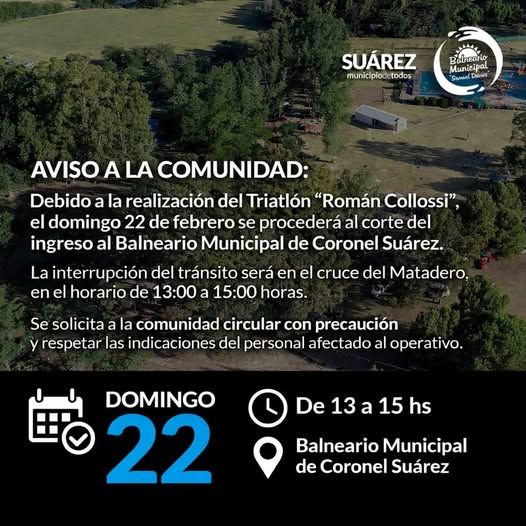 Debido a la realización del Triatlón “Román Collossi”, el domingo 22 de febrero se procederá al corte del ingreso al Balneario Municipal de Coronel Suárez.