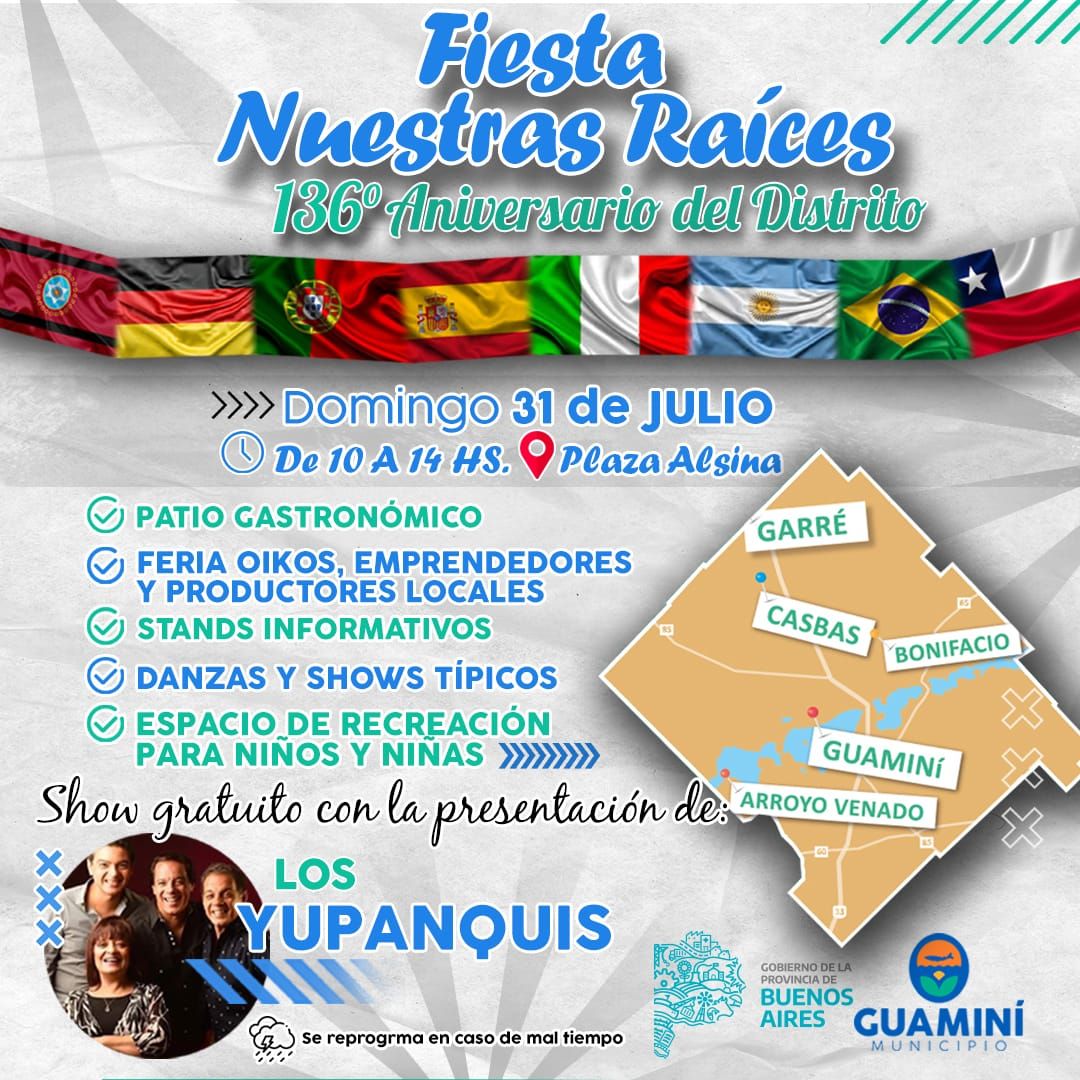 Con la presentación especial de “LOS YUPANQUIS” y la participación de artistas locales, te esperamos a partir de las 10 hs. en la plaza Alsina de Guaminí.
