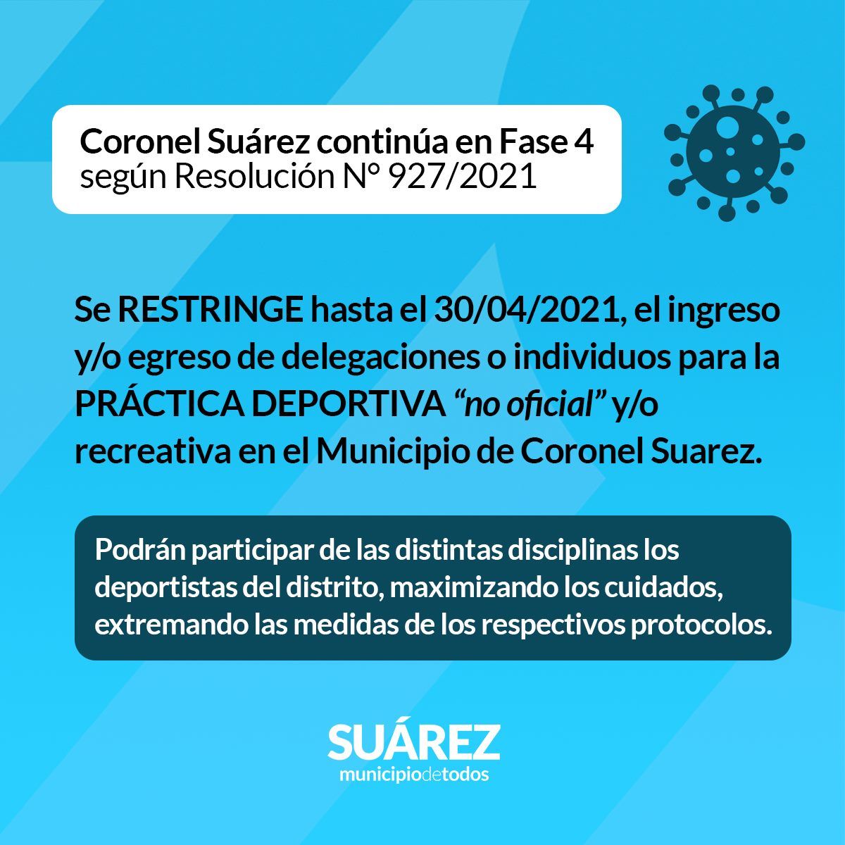 Se RESTRINGE el ingreso y/o egreso de delegaciones o individuos para la PRACTICA DEPORTIVA “no oficial” y/o recreativa en el Municipio de Coronel Suarez. Podrán participar de las distintas disciplinas los deportistas del distrito, maximizando los cuidados, extremando las medidas de los respectivos protocolos.