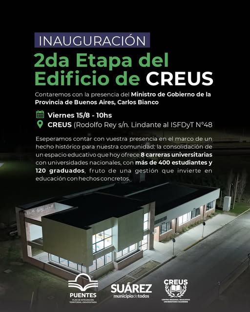 El próximo viernes 15 de agosto, a las 10:00 horas, el Intendente Ricardo Moccero encabezará el acto de inauguración de la segunda etapa del edificio del Centro Regional Educativo Universitario Suarense (CREUS), junto al Ministro de Gobierno de la Provincia de Buenos Aires, Carlos Bianco. El Intendente Municipal Ricardo Moccero invita a toda la comunidad, instituciones, vecinos y fuerzas vivas a participar del acto para ser parte de un hito que quedará marcado en la historia educativa del distrito