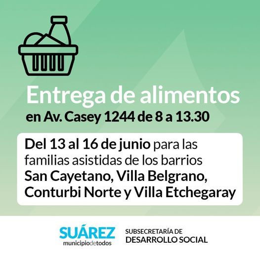 La subsecretaría de Desarrollo Social informa a las familias asistidas que continúa la entrega de alimentos secos correspondiente al mes de JUNIO, en Avenida Casey 1244, de 8 a 13:30.