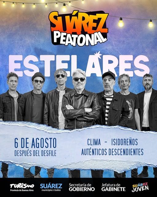 La banda Estelares llega a Suárez con sus clásicos “Un día perfecto”, “Aire”, “Ella dijo” y “El corazón sobre todo”, presentando además su nuevo disco “Los Lobos”. Una propuesta que sin dudas generará una gran movida regional, posicionando a Coronel Suárez como epicentro cultural del sudoeste bonaerense.