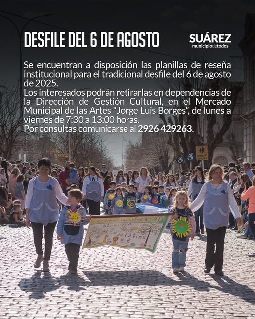 La Dirección de Gestión Cultural de la Municipalidad de Coronel Suárez, informa que se encuentran a disposición las planillas de reseña institucional para el tradicional desfile del 6 de agosto de 2025.