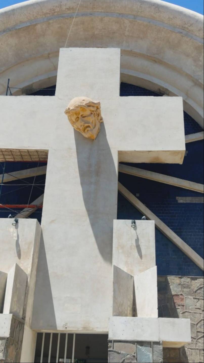 En la obra también se observa el uso de cerámicos azules, dándole un fondo celestial a la enorme cruz, que sostiene la cabeza del Cristo. Este detalle se observa en numerosas localidades bonaerenses.