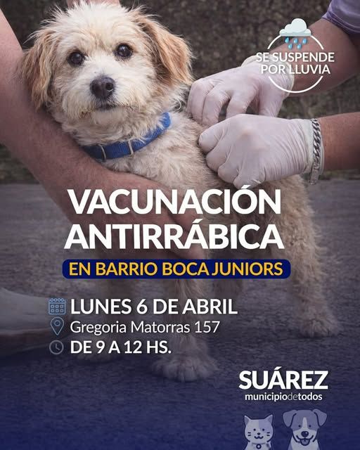El equipo de profesionales desarrollará este LUNES 6 DE ABRIL, una nueva jornada de vacunación antirrábica gratuita para perros y gatos en el Barrio Boca Juniors -Gregoria Matorras 157-