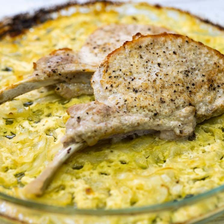 - Coloca las chuletas salpimentadas por encima de la crema y mete 5 minutos en el horno.