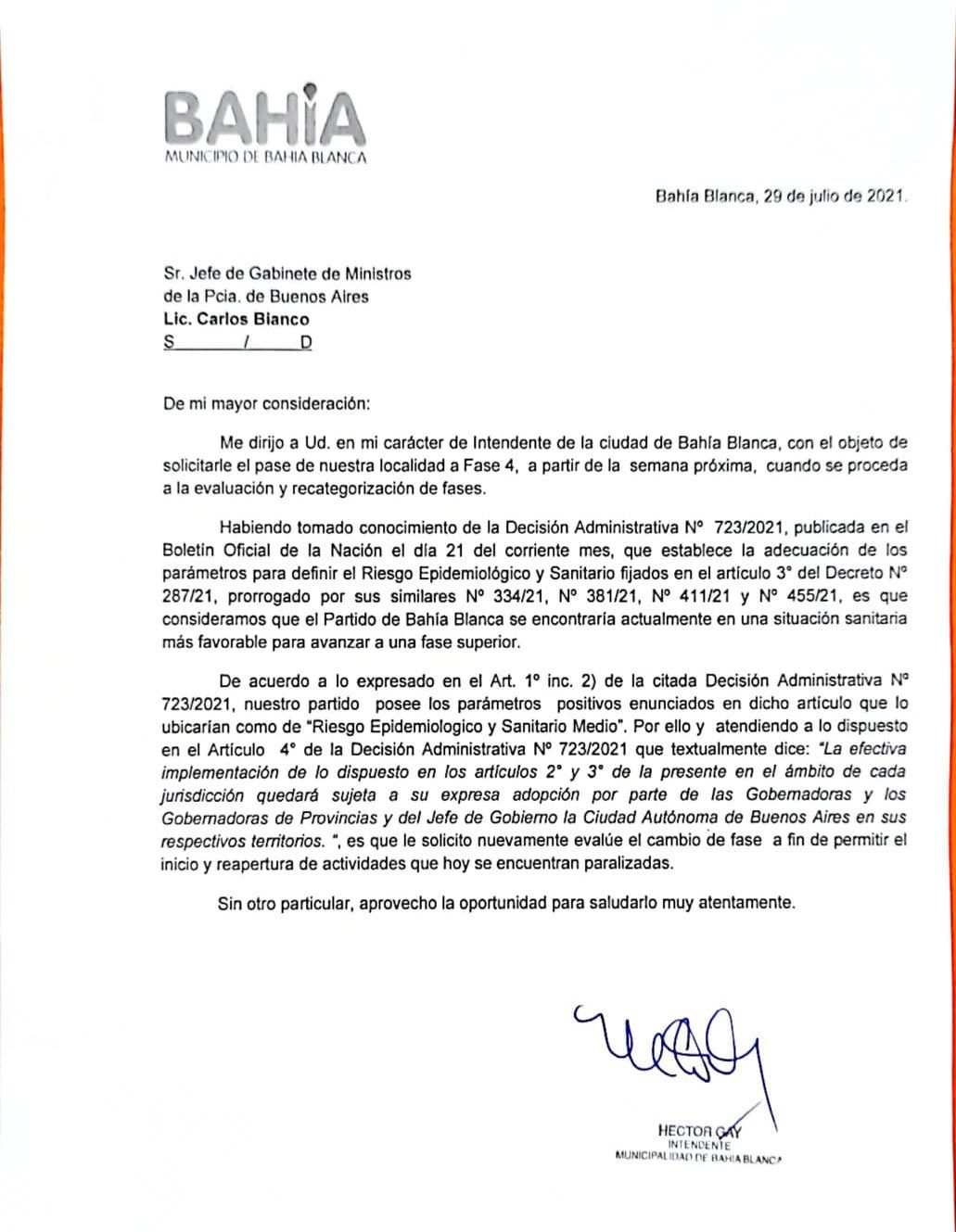 El municipio de Bahía Blanca le solicitó en las últimas horas a las autoridades de Provincia que Bahía Blanca regrese a fase 4, mediante una carta remitida por el propio intendente Héctor Gay al Jefe de Gabinete de Ministros bonaerense, Carlos Bianco.