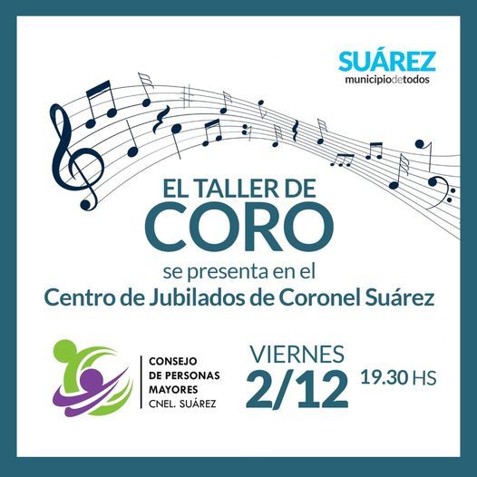 A cargo de los profesores Alicia y Osvaldo Berón, integrantes del Taller de Coro del Consejo de Personas Mayores realizarán una presentación coral el viernes --2 de diciembre-- a las 19:30, en el Centro de Jubilados y Pensionados de Coronel Suárez.