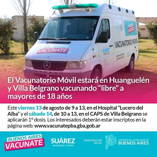Este viernes 13 de agosto de 9 a 13, en el Hospital “Lucero del Alba” y el sábado 14, de 10 a 13, en el CAPS de Villa Belgrano se aplicarán 1° dosis. Los interesados deberán estar inscriptos en la página web: www.vacunatepba.gba.gob.ar