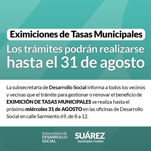 La subsecretaría de Desarrollo Social informa a todos los vecinos y vecinas que el trámite para gestionar o renovar el beneficio de EXIMICIÓN DE TASAS MUNICIPALES se realiza hasta el próximo miércoles 31 de AGOSTO en las oficinas de Desarrollo Social en calle Sarmiento 69, de 8 a 12.