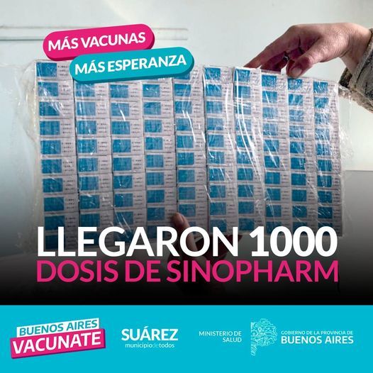 Tal cual adelantaron desde Región Sanitaria 1, hoy (martes 6 de julio) arribaron a la Posta de Vacunación de Coronel Suárez 1000 dosis de la vacuna Sinopharm en el marco de la campaña #BuenosAiresVacunateSi sos mayor de 18 y todavía no te inscribiste para recibir la vacuna ingresá a www.vacunatepba.gba.gob.ar