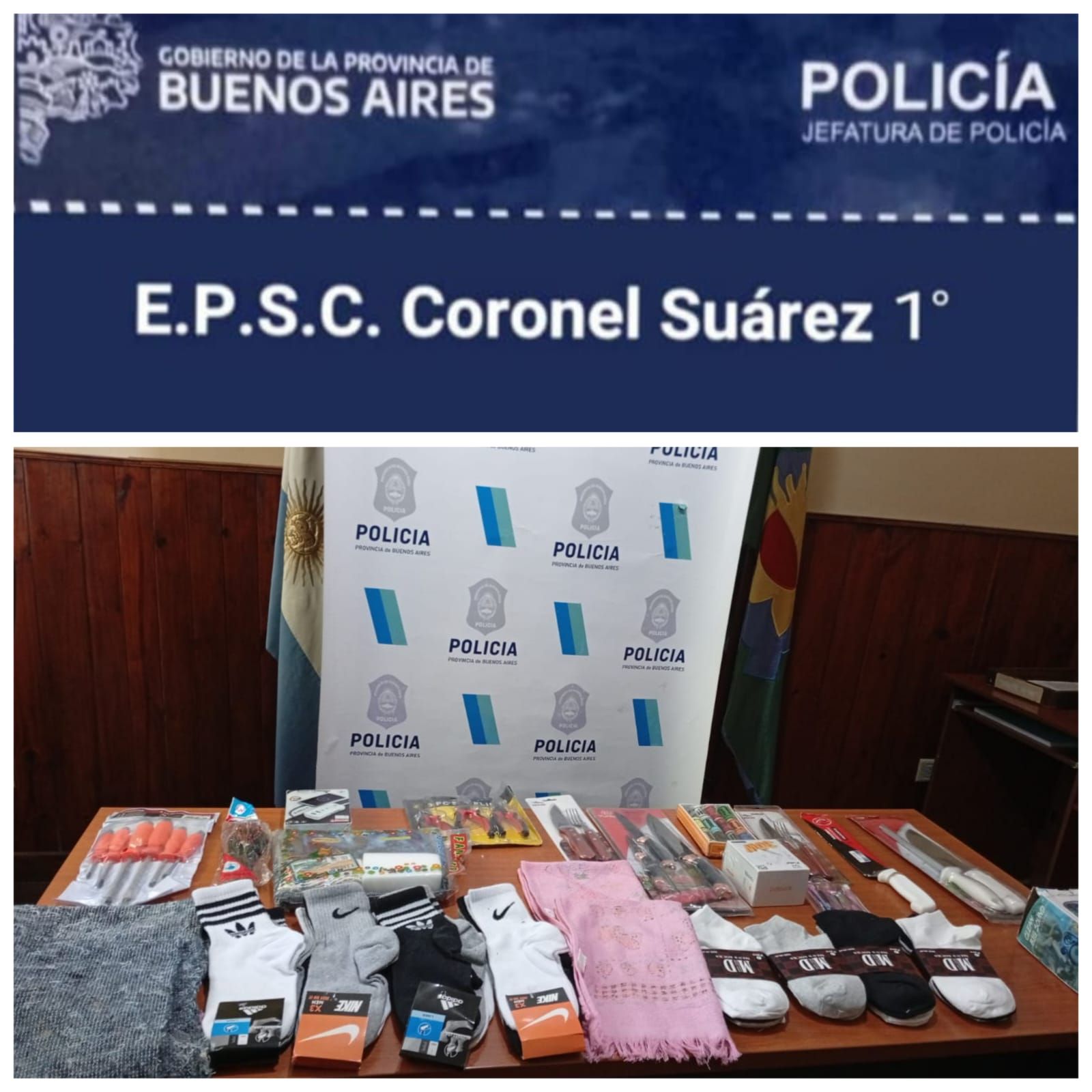 Se procedió al secuestro preventivo de diversos elementos destinados a la venta, entre ellos parlantes, cuchillos, sets de herramientas, medias, cargadores, artículos de limpieza y otros productos.