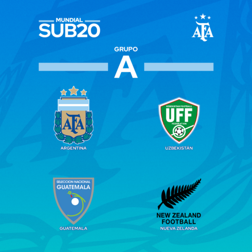 El seleccionado argentino de fútbol Sub 20 compartirá el grupo A del Mundial de la categoría que se jugará en la Argentina con Uzbekistán (rival del debut), Guatemala y Nueva Zelanda, según el sorteo de la FIFA realizado hoy.
