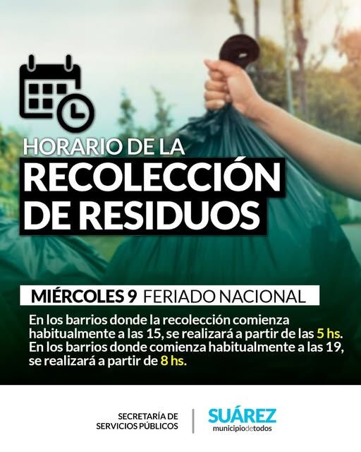La secretaria de Servicios Públicos informa a la comunidad que este miércoles 9 de Julio -Día de la Independencia- el Servicio de recolección de residuos domiciliarios se prestará de la siguiente manera: