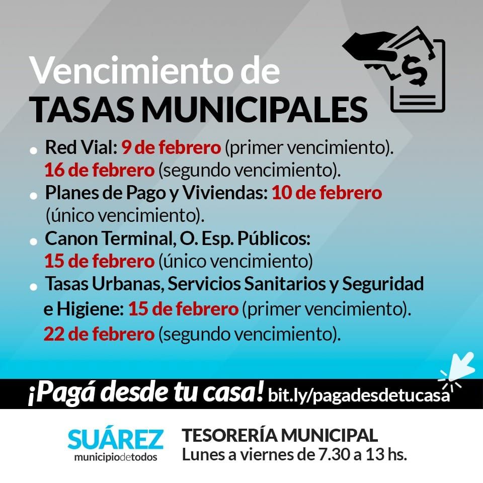 Tasas Urbanas, Servicios Sanitarios y Seguridad e Higiene: Primer vencimiento 15/2. Segundo vencimiento 22 de febrero.