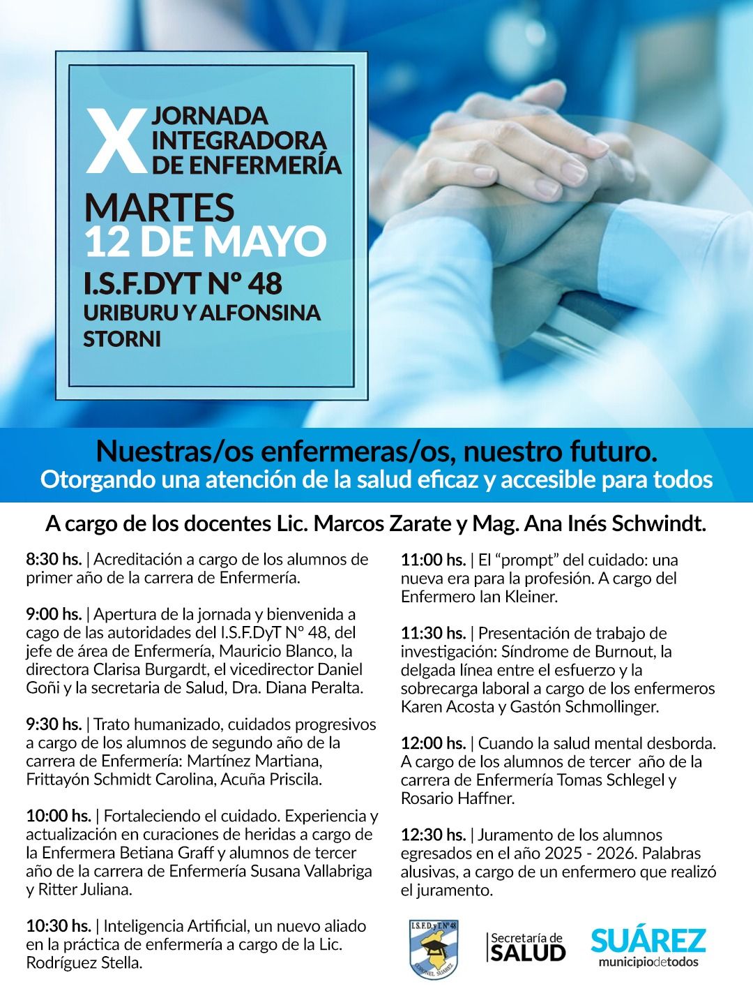 - 9:00hs. Apertura de la jornada y bienvenida a cago de las autoridades del I.S.F.DyT Nº 48, del jefe de área de Enfermería, Mauricio Blanco, la directora Clarisa Burgardt, el vicedirector Daniel Goñi y la secretaria de Salud, Dra. Diana Peralta.