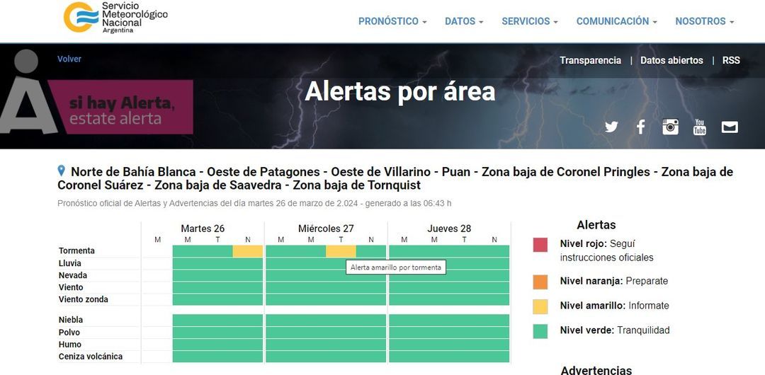 El área será afectada por tormentas, algunas localmente fuertes. Las mismas podrán estar acompañadas por ráfagas intensas, importante actividad eléctrica, ocasional caída de granizo y principalmente abundante caída de agua en cortos períodos. Se estiman valores de precipitación acumulada entre 30 y 50 mm, pudiendo ser superados en forma puntual.