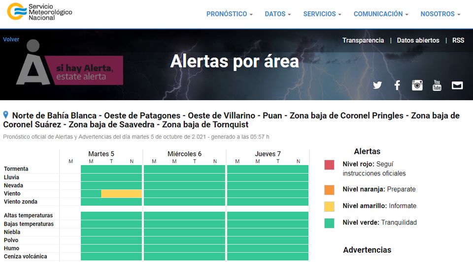 El área será afectada por vientos del sector sur con velocidades entre 30 y 50 km/h, y ráfagas que pueden alcanzar los 75 km/h