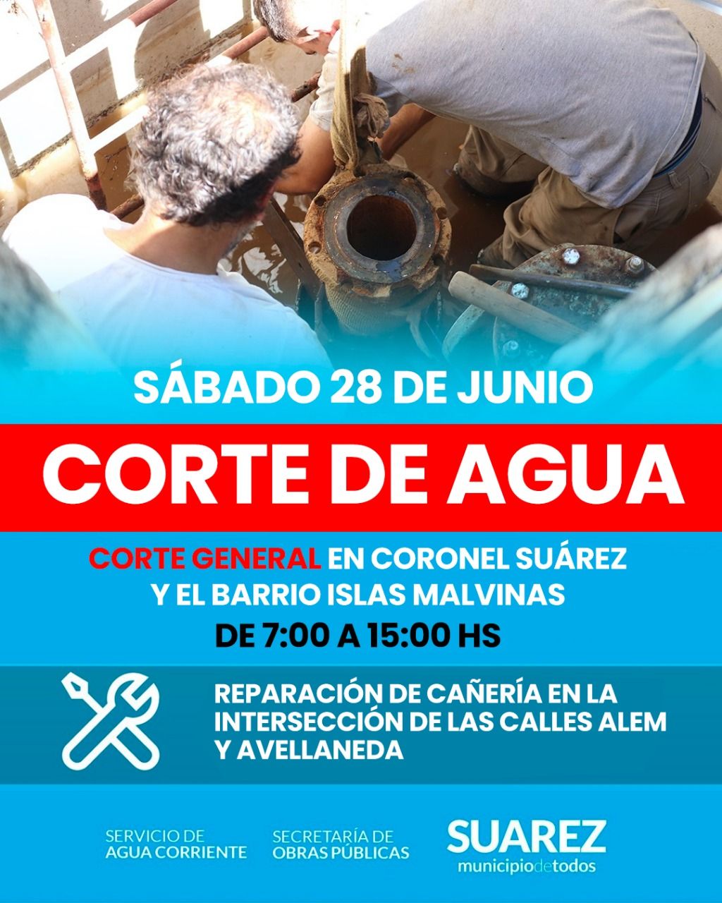 El servicio de Agua Corriente dependiente de la Secretaría de Obras Públicas informa que este sábado 28 de junio, se realizará un corte general de agua en toda la localidad de Coronel Suárez y el barrio Islas Malvinas.