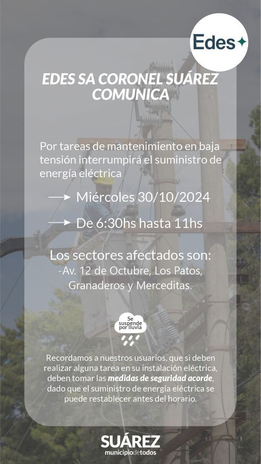 Edes SA Coronel Suárez comunica a sus usuarios que por tareas de mantenimiento en media tensión interrumpirá el suministro de energía eléctrica el miércoles 30 de octubre desde las 06:30hs hasta las 11:00hs.