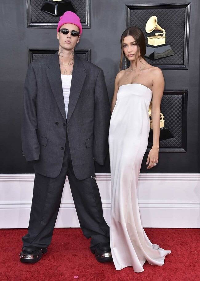 El cantautor canadiense de 28 años vistió un traje oversize de la reconocida marca Balenciaga, unos zapatos de estilo croc de gran formato, acompañado de unos lentes oscuros que cubrían su rostro. Por otro lado, su esposa Hailey optó por un vestido blanco de Saint Laurent, de corte recto y estilo de novia. Por su particular presencia, fueron nombrados por los espectadores como la "la pareja más cool de los Grammys".