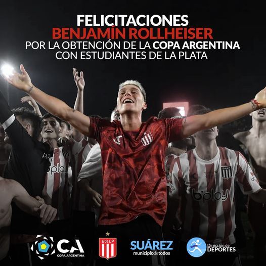 El Intendente Municipal Ricardo Moccero felicita al suarense Benjamín Rollheiser por la obtención de la Copa Argentina junto al equipo de Estudiantes de La Plata, clasificándose a la Copa Libertadores 2024.