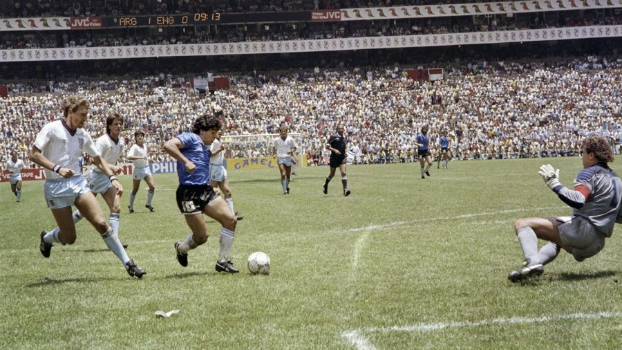 Con esa camiseta azul con el número 10, Maradona le hizo los dos tantos a Inglaterra. El primerio golpeando el balón con la manos superando la salida del arquero inglés Peter Shilton y el 2-0 con una gran jugada en la cual eliminó a cinco defensores ingleses en el gol que fue elegido en 2002, en una votación de la FIFA, como "el gol del siglo".