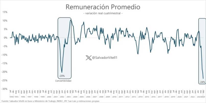 Los salarios de los trabajadores tuvieron una caída del 26% interanual en febrero, según los cálculos del economista Salvador Vitelli, quien aportó que con el retroceso del segundo mes del año se alcanzó la peor caída cuatrimestral en la historia del índice. En este sentido superaron el derrumbe de la convertibilidad en cuanto a un periodo de cuatro meses, que fue del 20%, y se acercan al mínimo mensual.