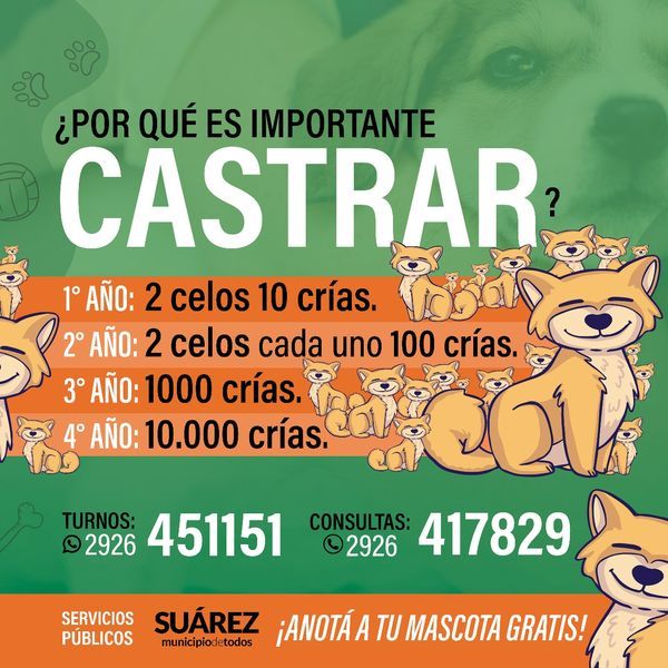 El Municipio a través de los profesionales veterinarios dependientes de la secretaria de Servicios Públicos, ofrece el servicio de castraciones para perros y gatos, tanto machos como hembras, con el objetivo de controlar la población animal, prevenir enfermedades y mejorar la calidad de vida de las mascotas. La castración es una cirugía segura y rutinaria.