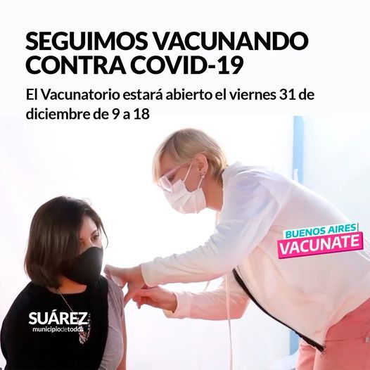 Se informa a la comunidad que el Vacunatorio estará abierto el viernes 31 de diciembre de 9 a 18 para todos aquellos vecinos y vecinas que quieran vacunarse o completar el esquema de vacunación.