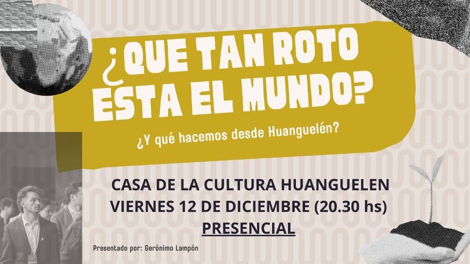 Te invitamos este viernes 12, a las 20:30, en el Centro Cultural de Huanguelén, a escuchar su mirada sobre el estado actual del mundo: clima, inteligencia artificial, salud mental, juventud… y, sobre todo, qué podemos hacer desde Huanguelén para ser parte de la solución.