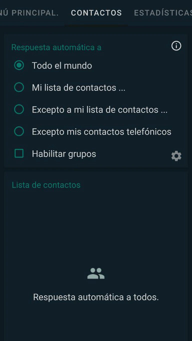 Todo el mundo: Enviará el mensaje de respuesta a todas las personas que escriban a WhatsApp, estén en su lista de contactos o no.